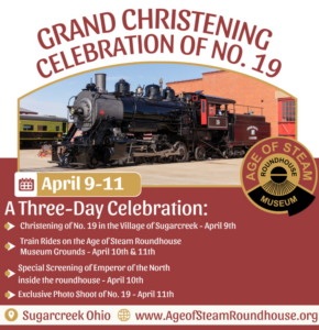 The celebration begins on Thursday, April 9, when Engine No. 19 will journey into the heart of the Village of Sugarcreek for a special public display.